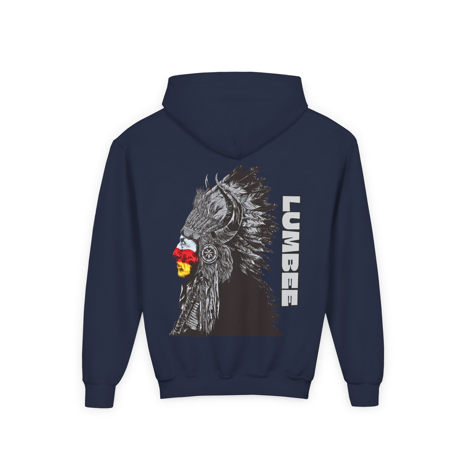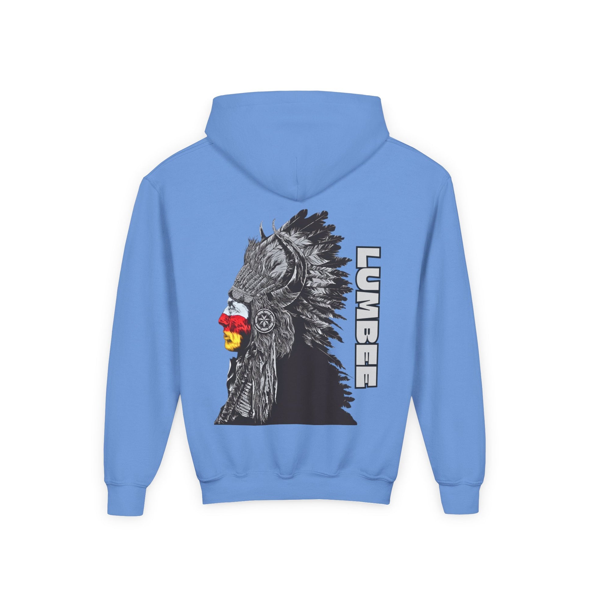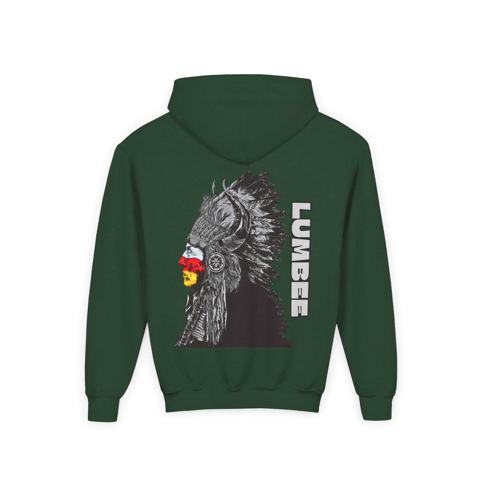 This is our 910 Indian Chief Kids Graphic Hoodie. It has our signature logo on the front, and on the back is an Indian Chief with face paint the same color as our Tribe's colors, with the word Lumbee.