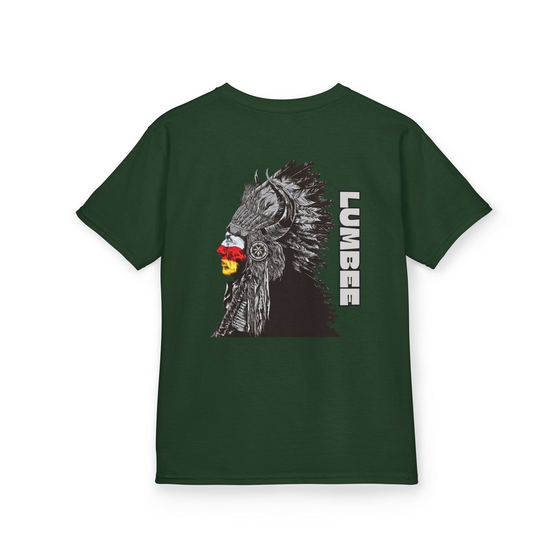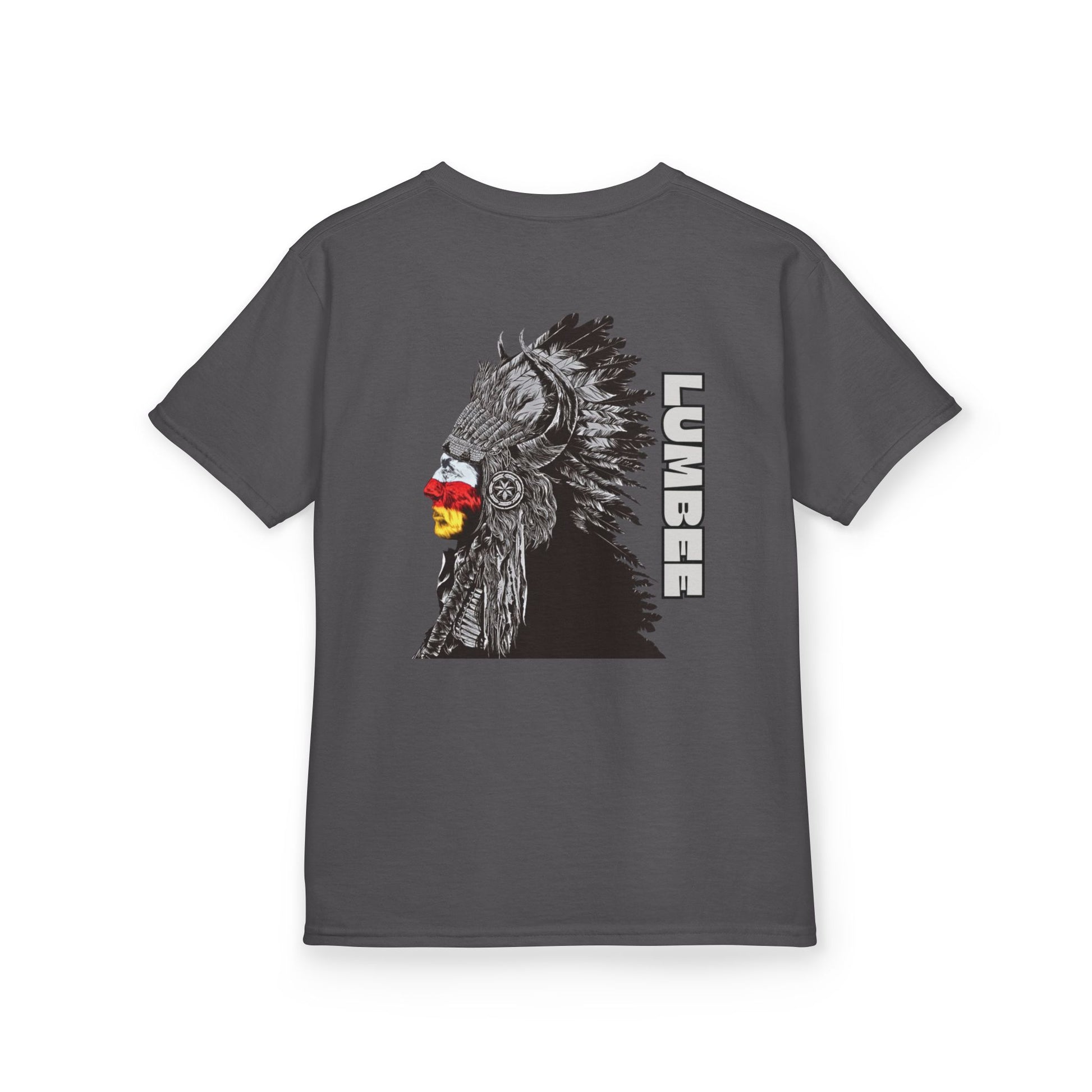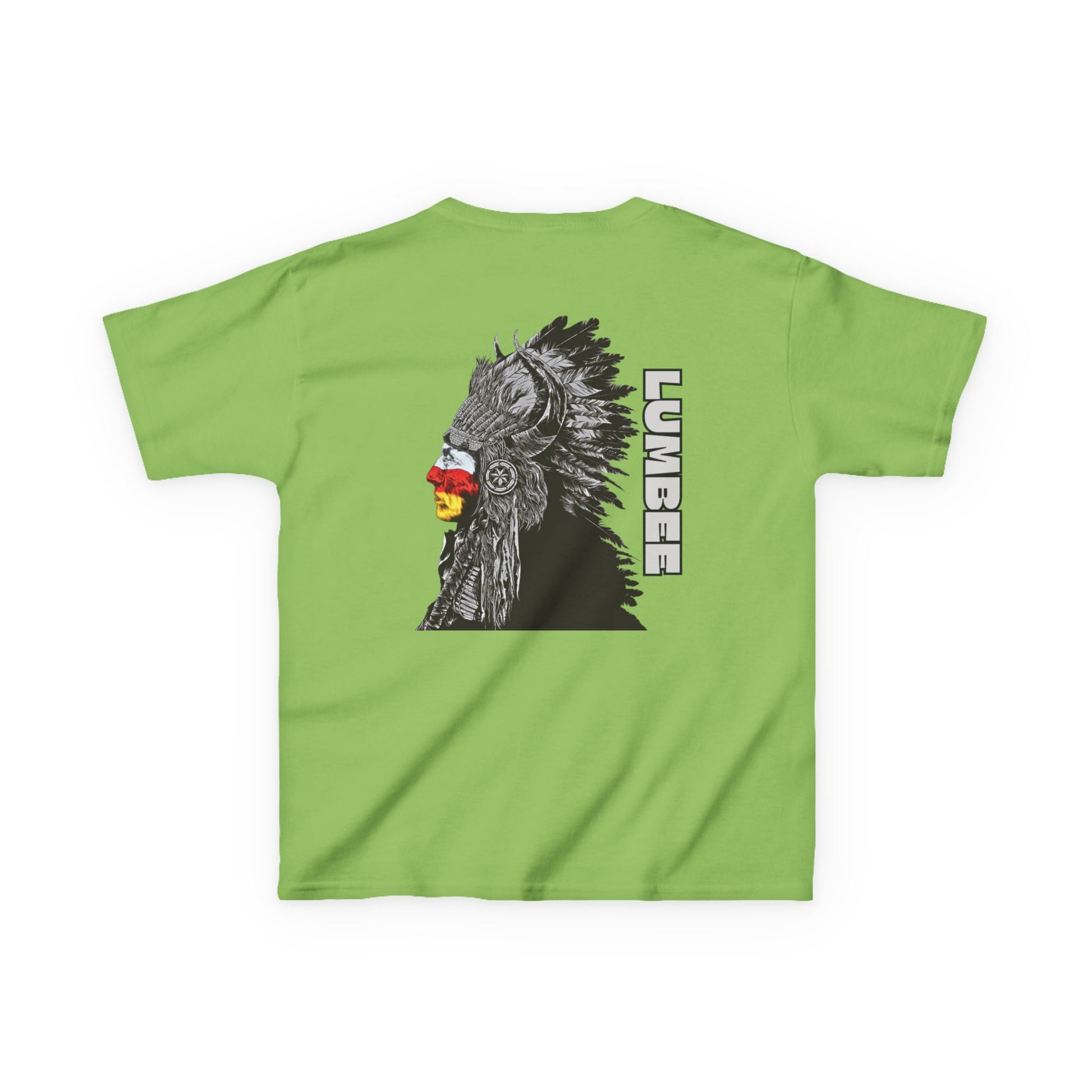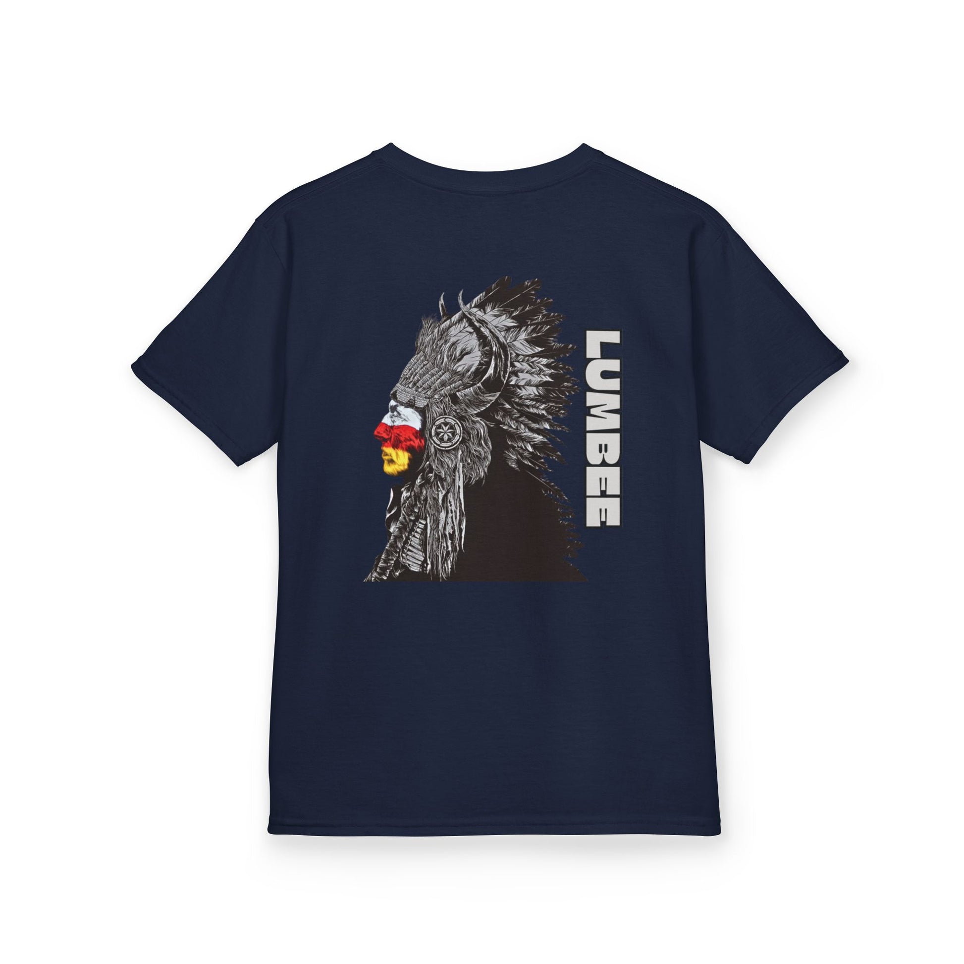 This is our 910 Indian Chief Kids Graphic Tee. It has our signature logo on the front, and on the back is an Indian Chief with face paint the same color as our Tribe's colors, with the word Lumbee.