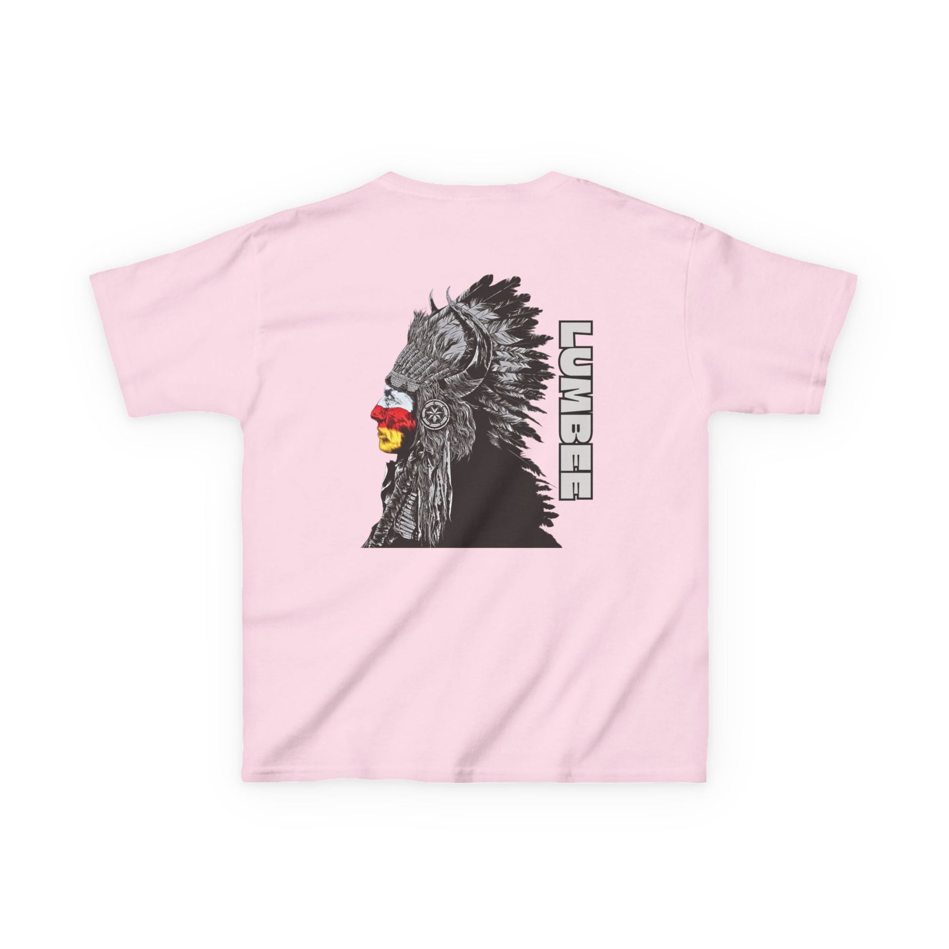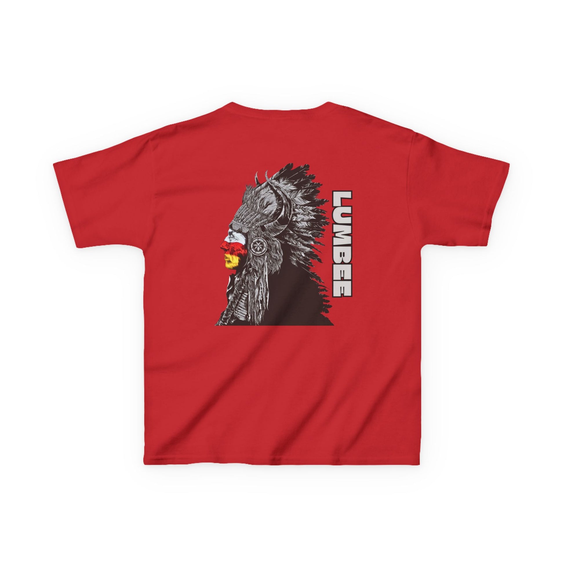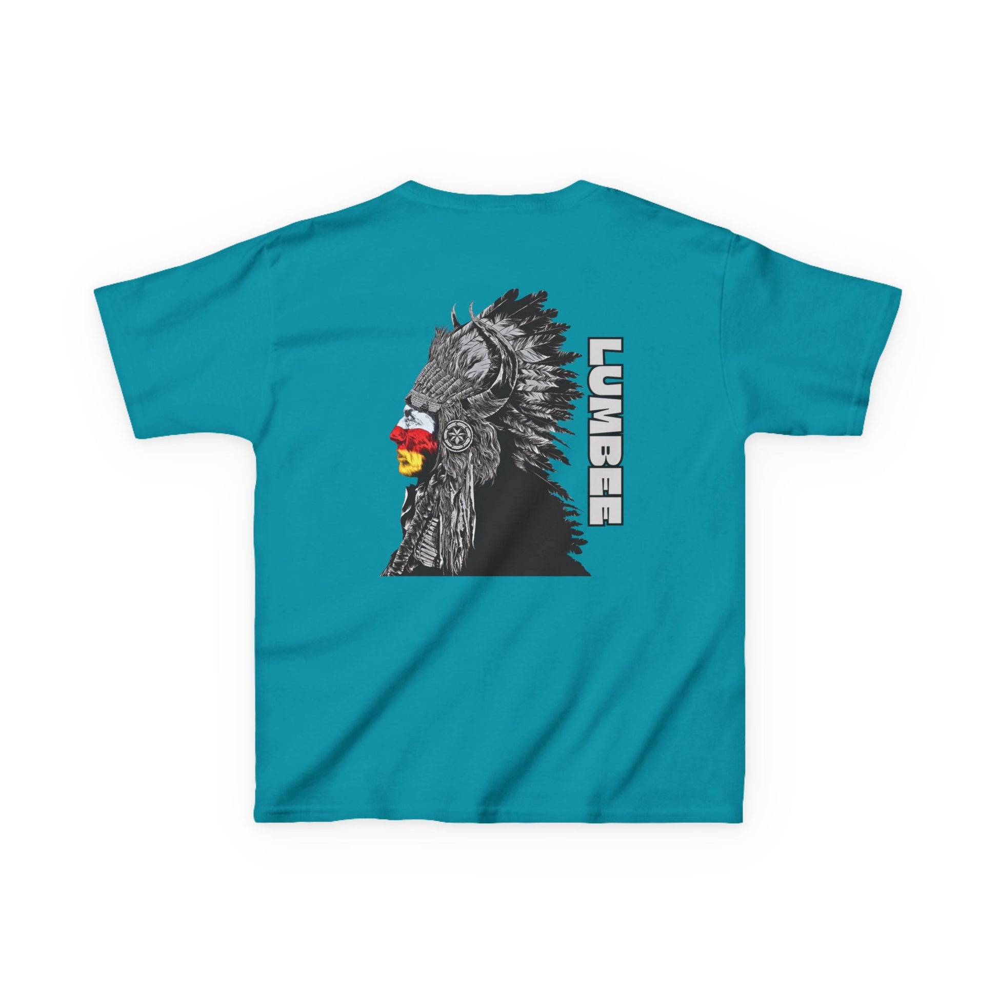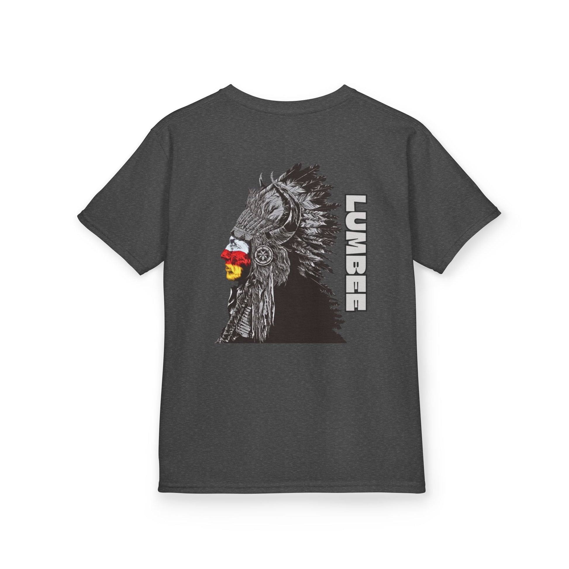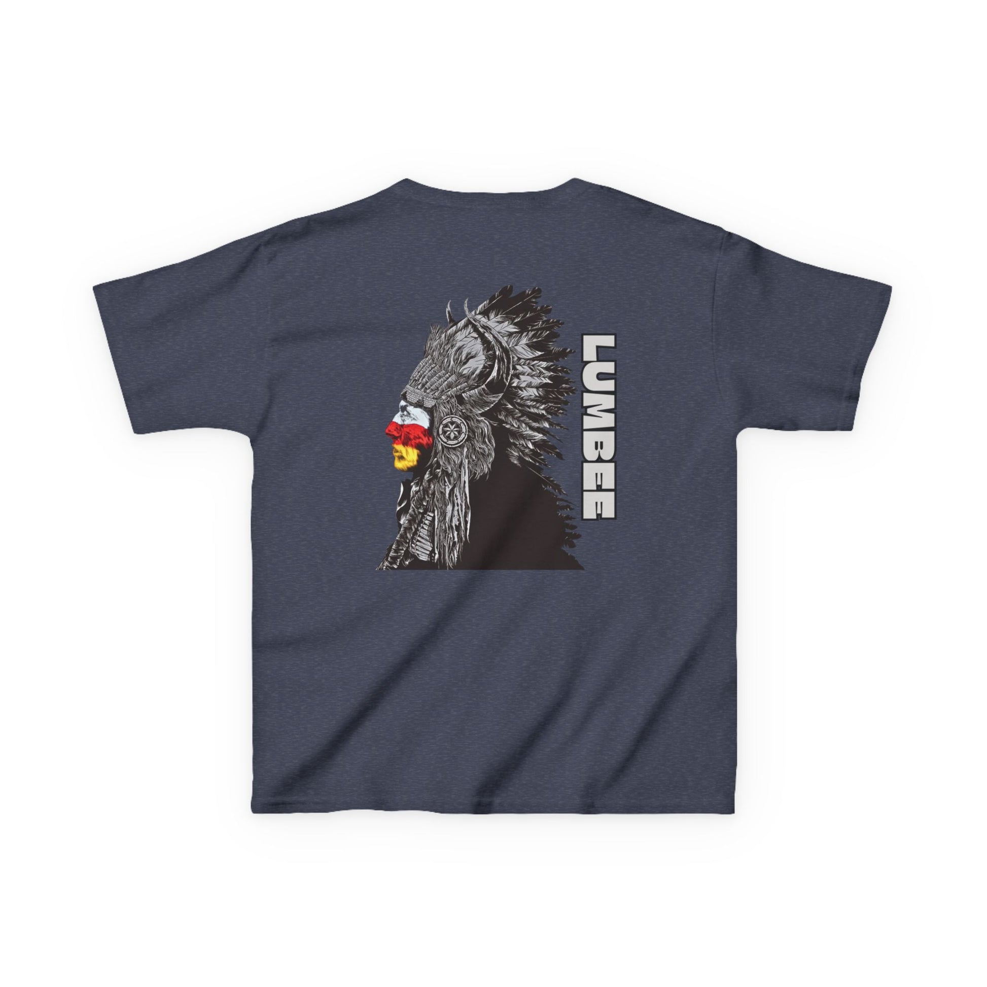 This is our 910 Indian Chief Kids Graphic Tee. It has our signature logo on the front, and on the back is an Indian Chief with face paint the same color as our Tribe's colors, with the word Lumbee.
