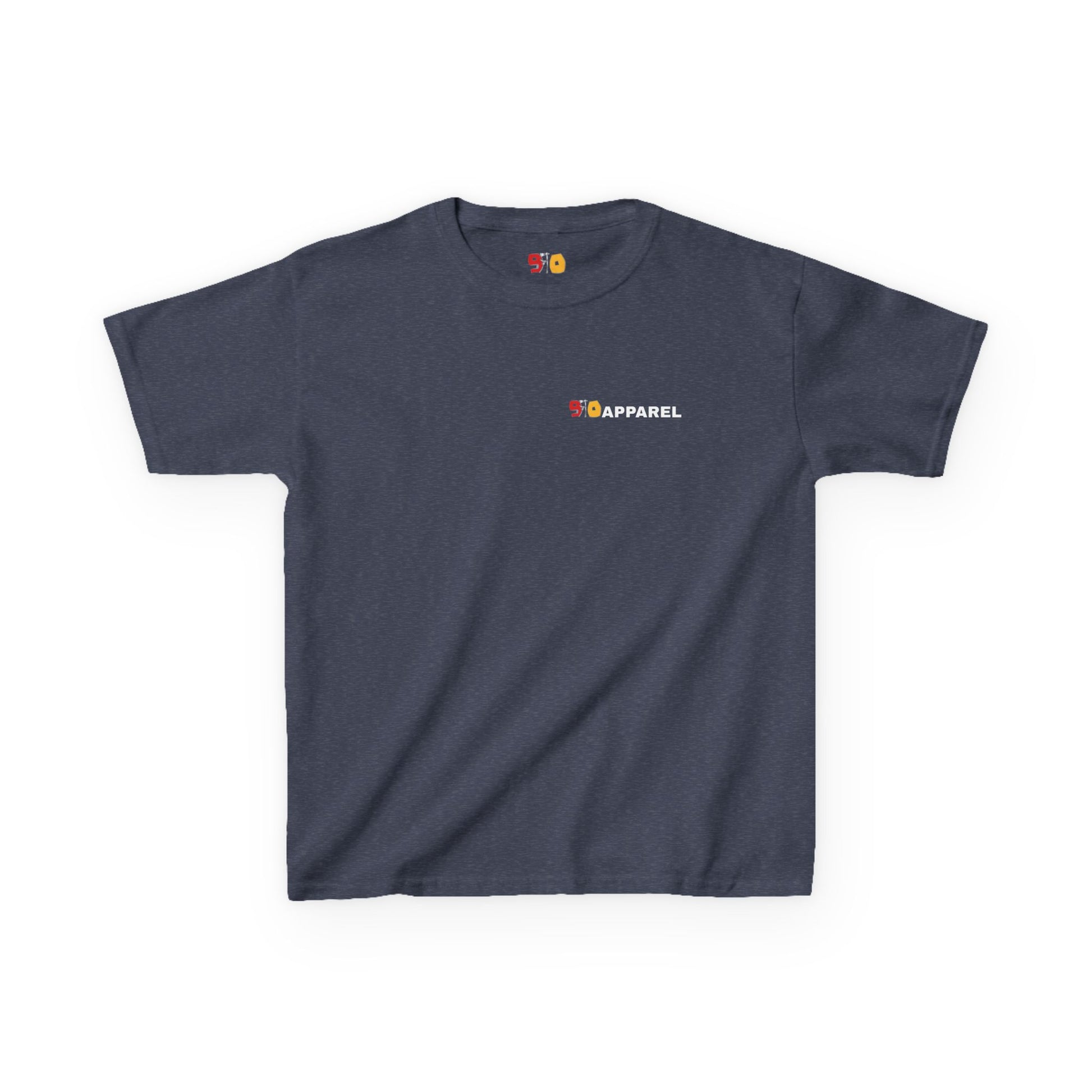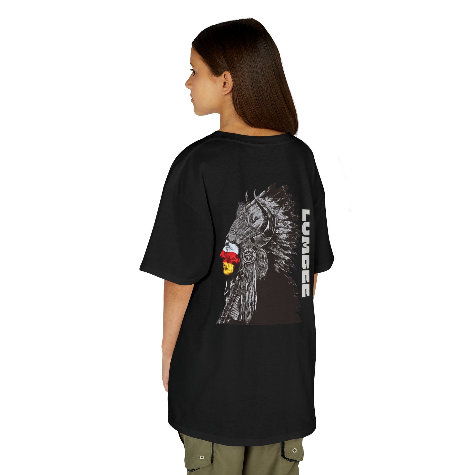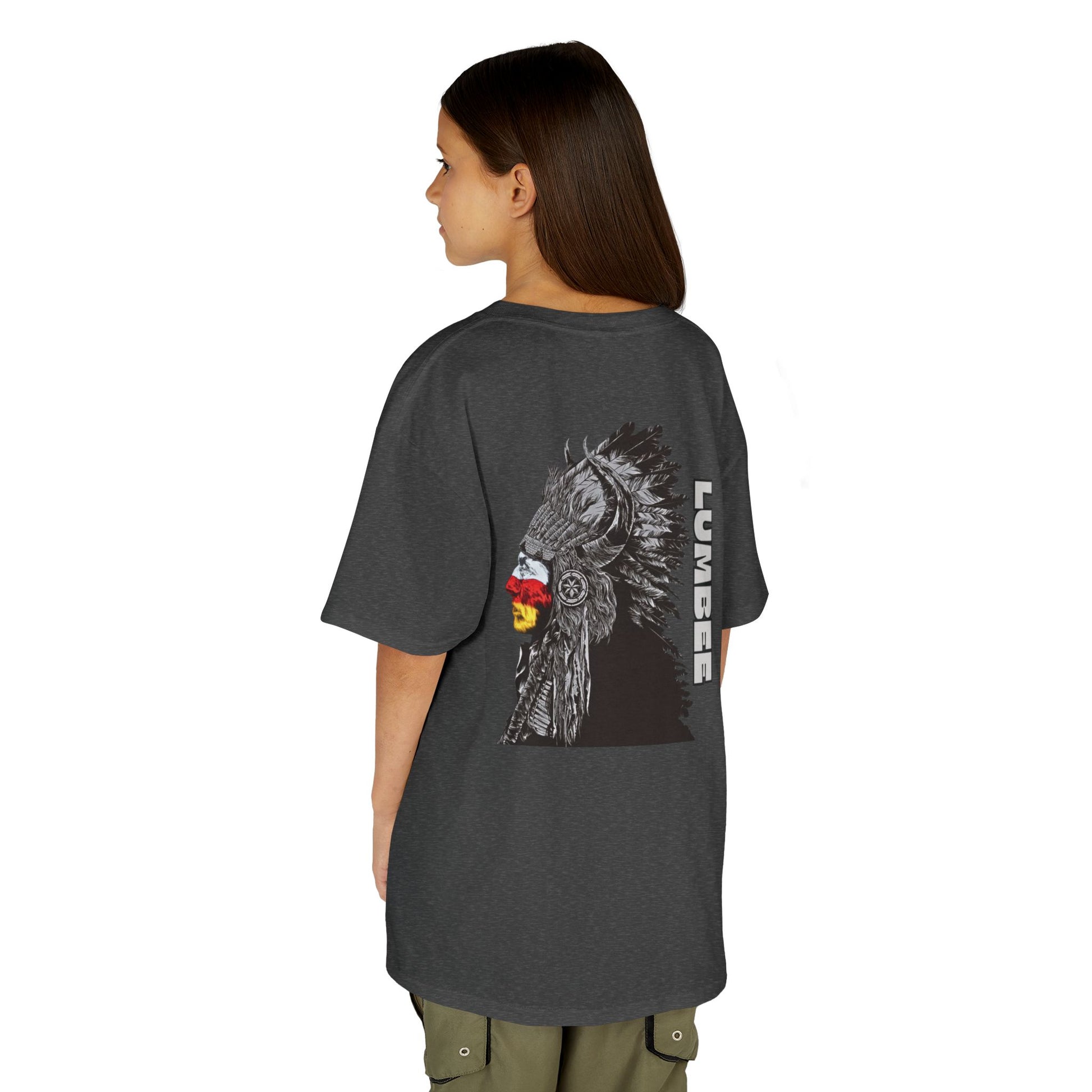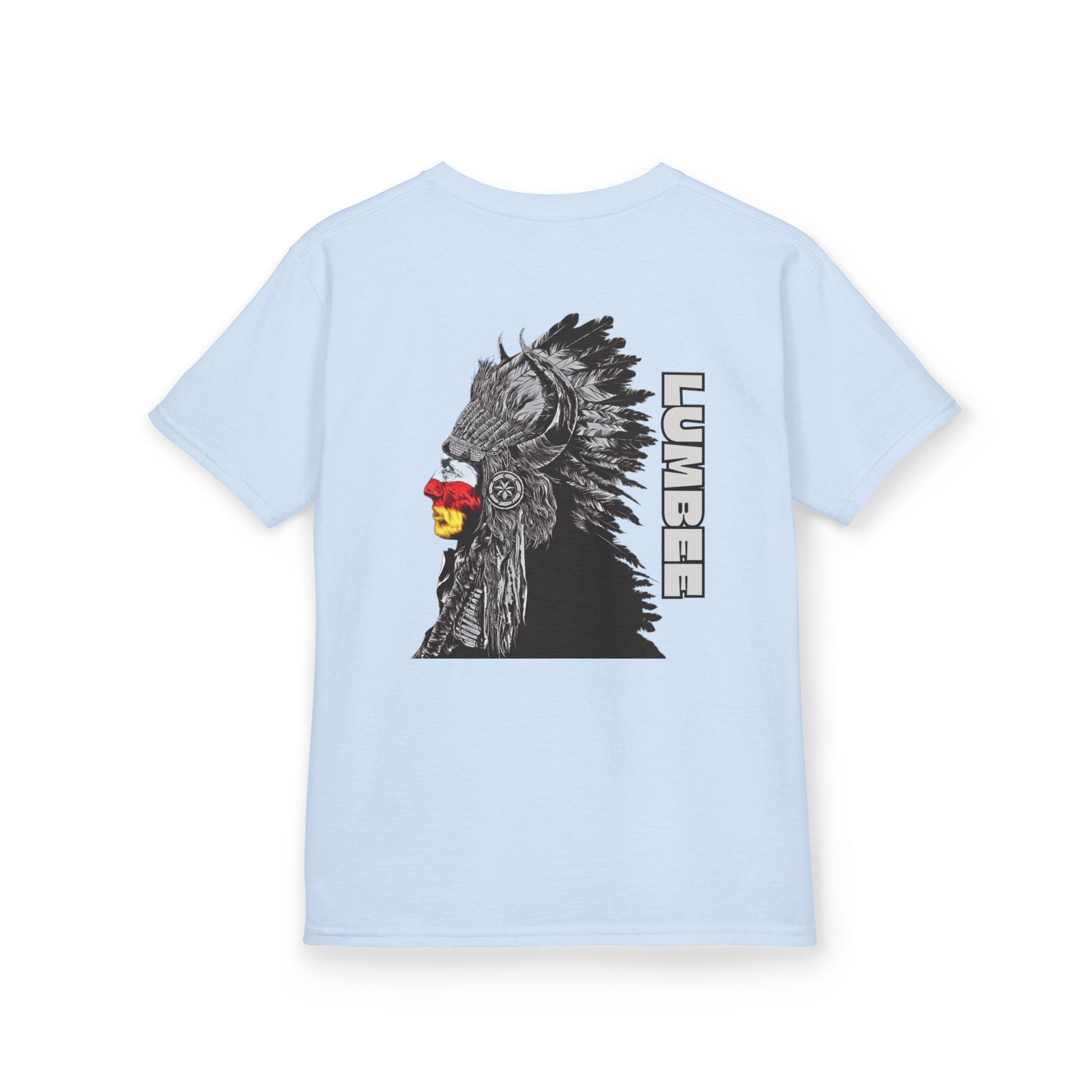 This is our 910 Indian Chief Kids Graphic Tee. It has our signature logo on the front, and on the back is an Indian Chief with face paint the same color as our Tribe's colors, with the word Lumbee.