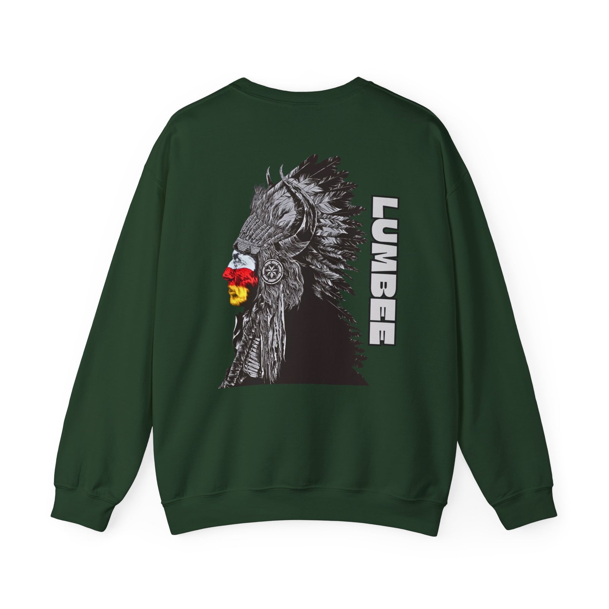 This is our 910 Indian Chief Sweatshirt. It has our signature logo on the front, and on the back is an Indian Chief with face paint the same color as our Tribe's colors, with the word Lumbee.