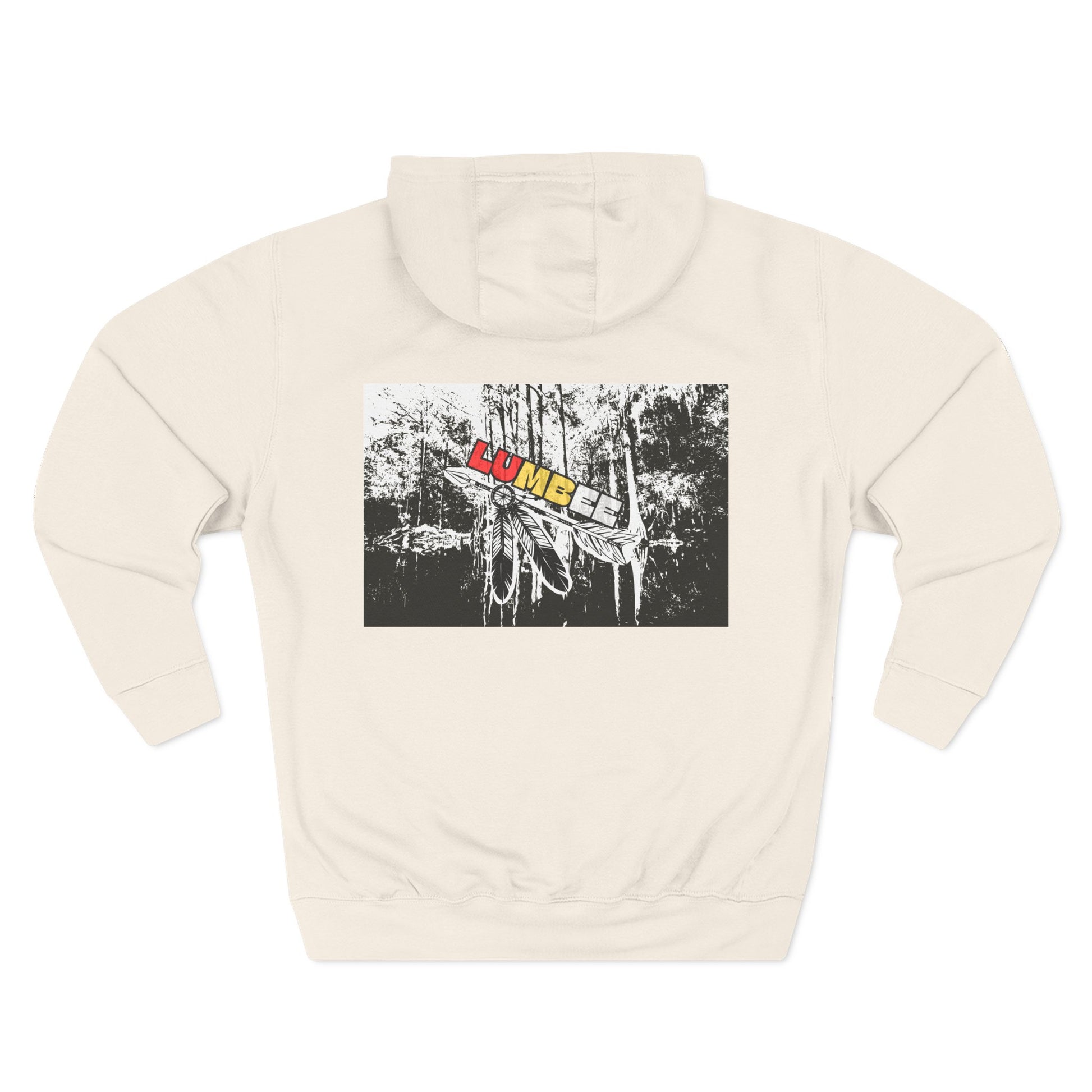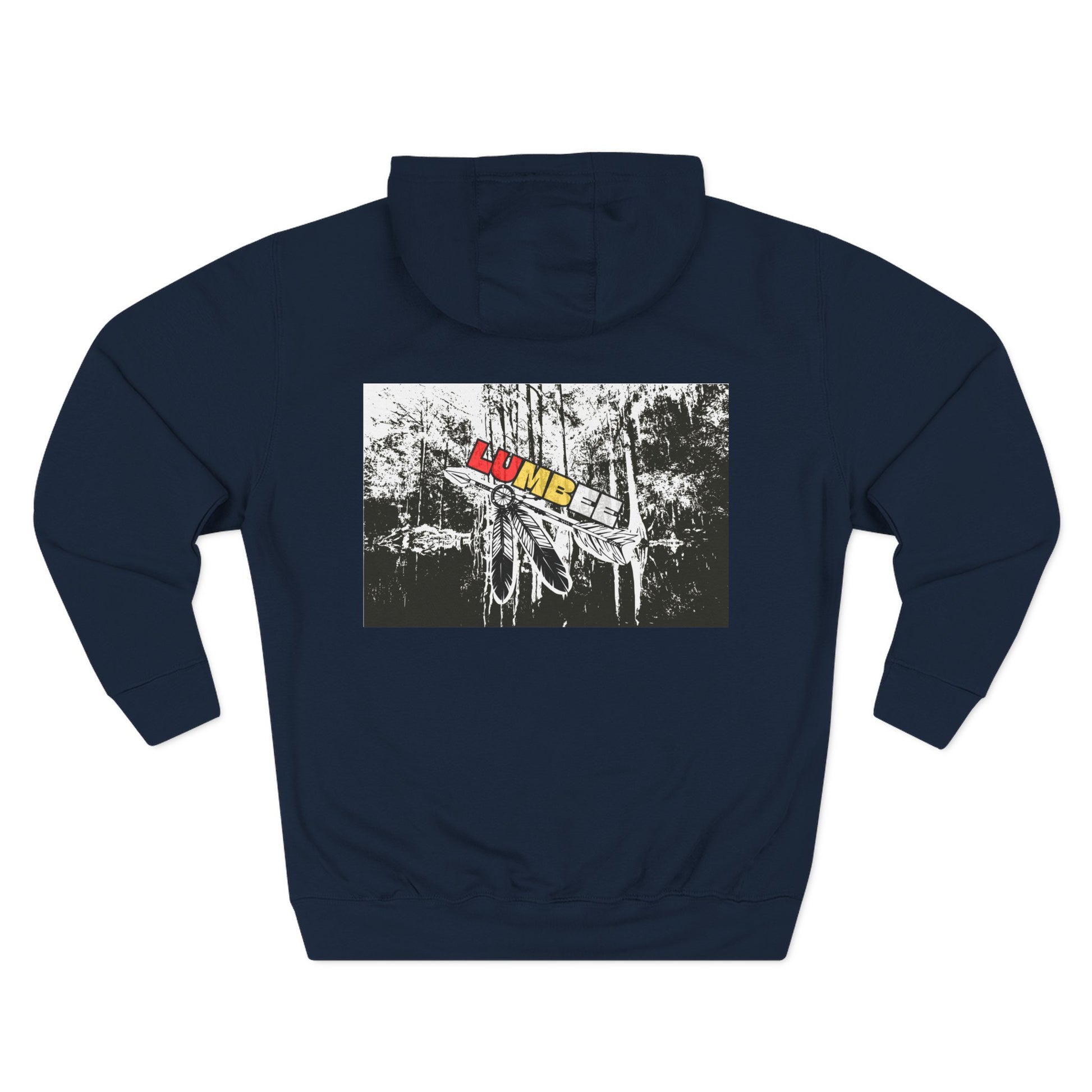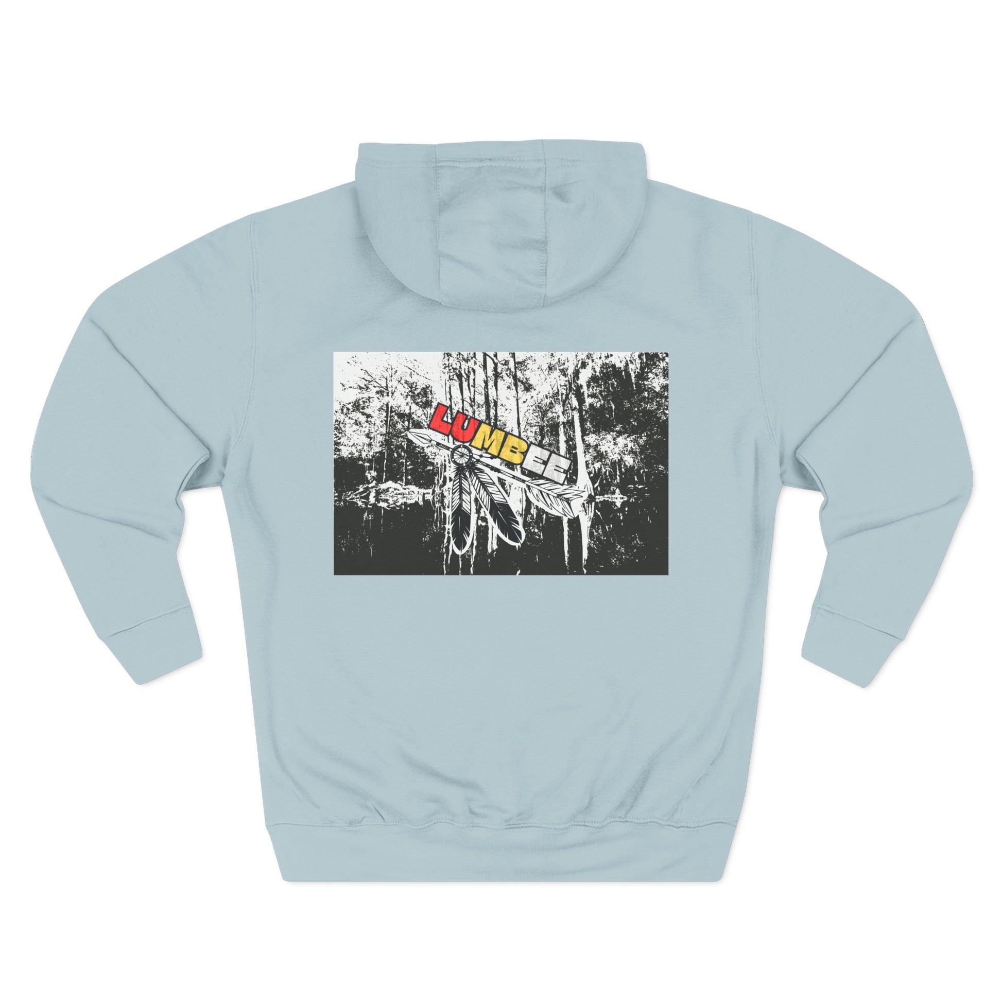 This is our 910 Lumber River Fleece Hoodie. The river is a very important part of the Lumbee people's history and culture; that's why I wanted to create a symbolic design for our people. It also has our signature Lumbee design incorporated.
