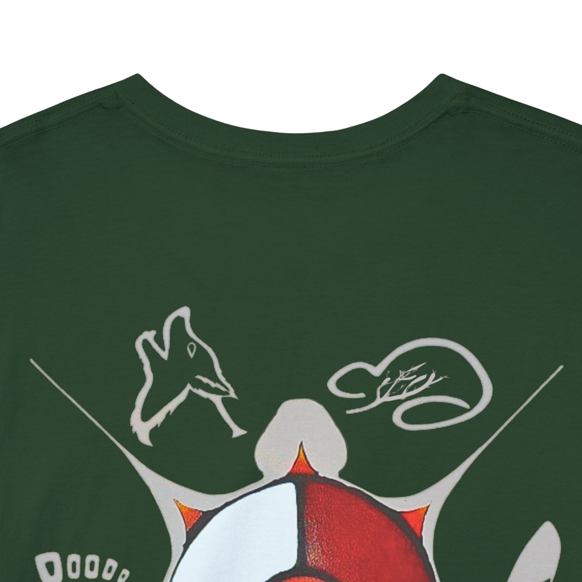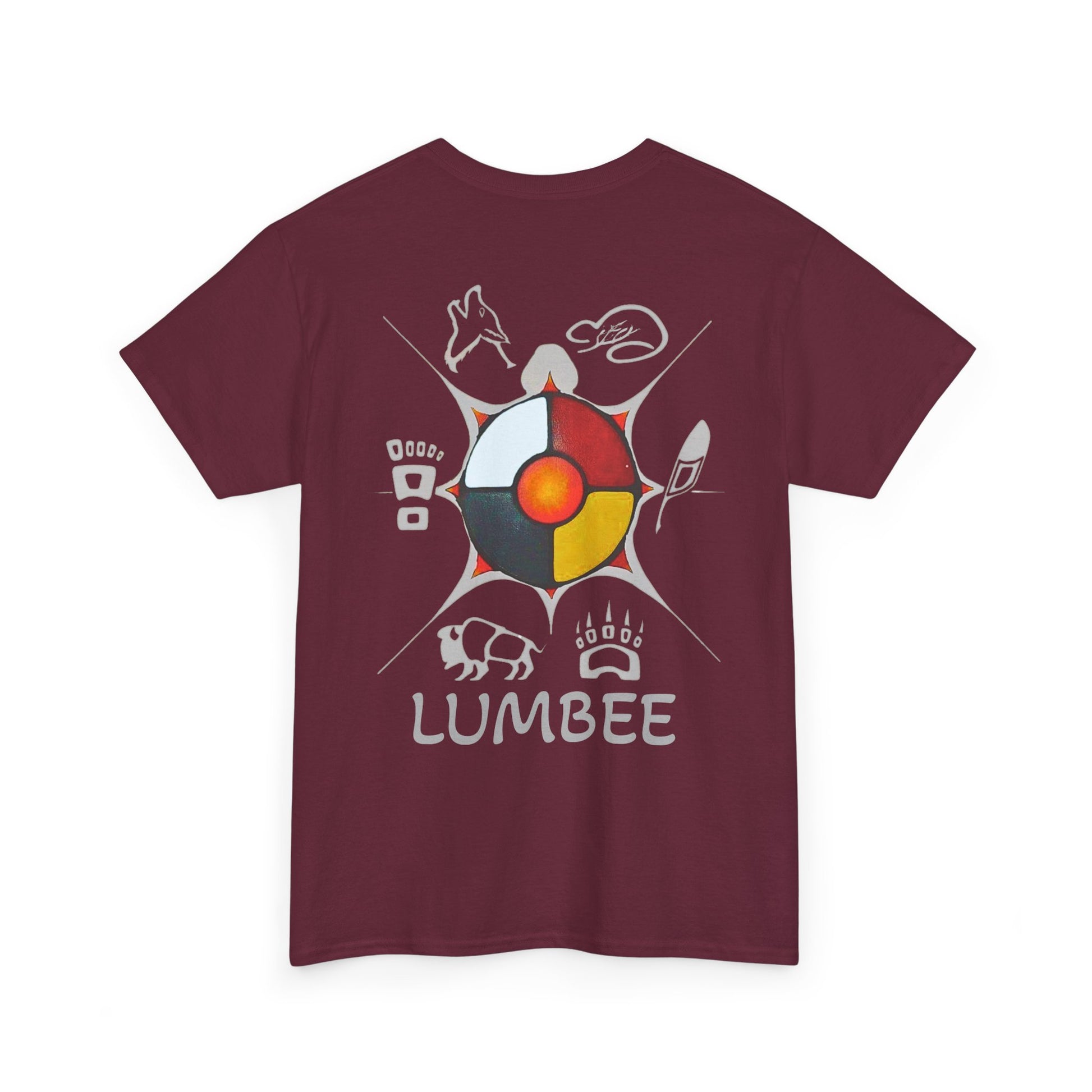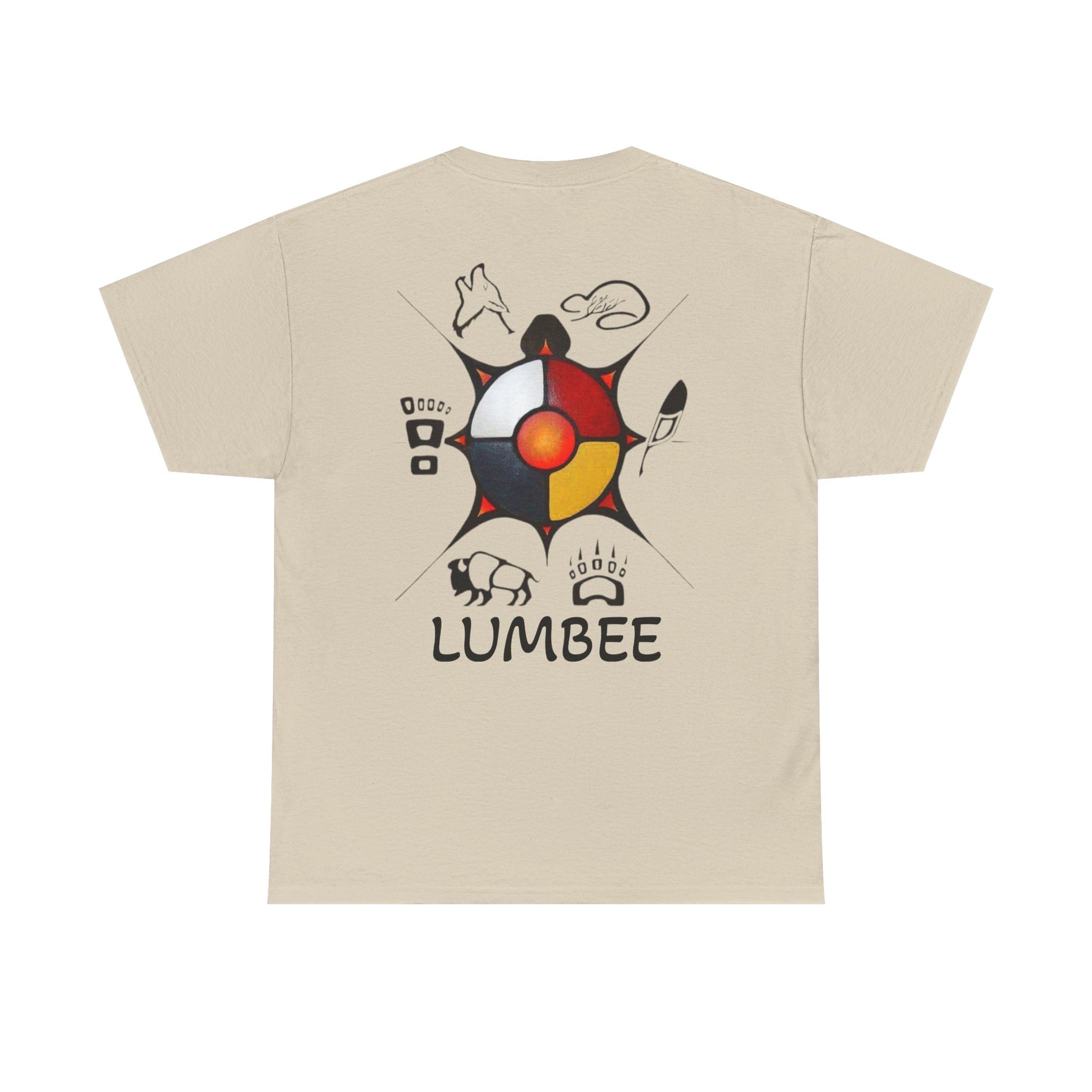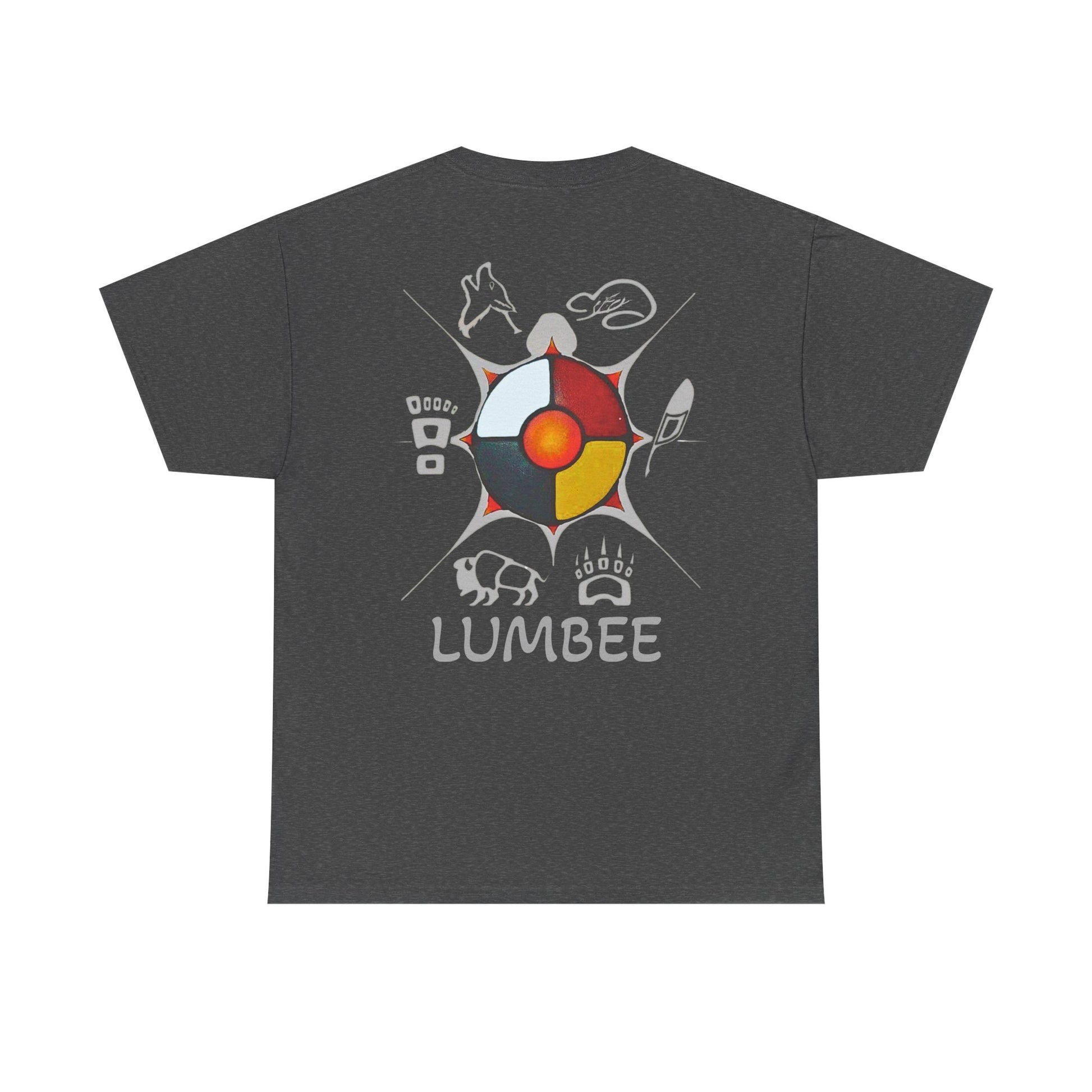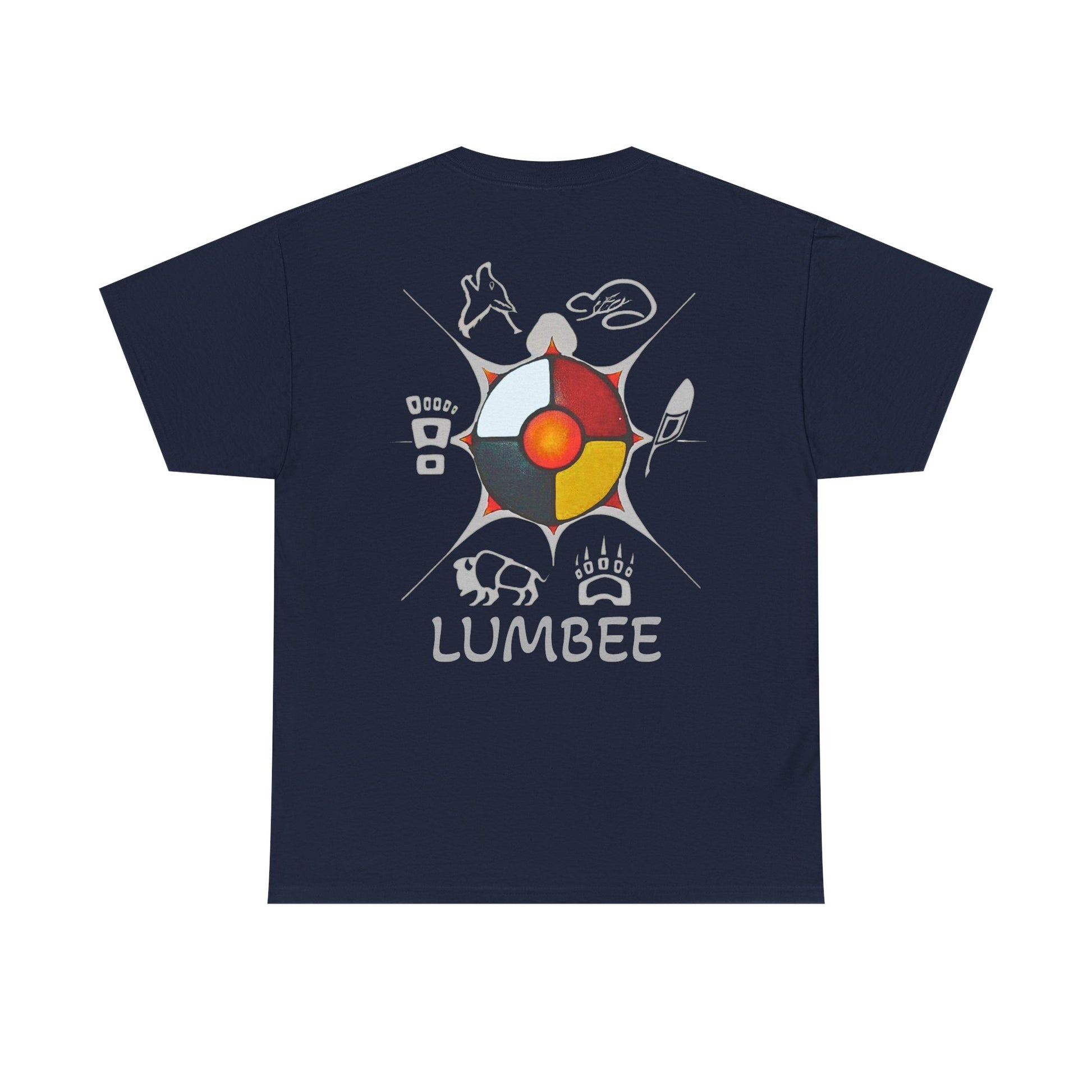 This is our Cultural Medicine Wheel Graphic Tee. The front has a small, subtle logo over the heart; the back has the medicine wheel with Native art surrounding. Wear this tee to community gatherings, powwows, or casual days whenever you want to rep our Lumbee culture and pride.