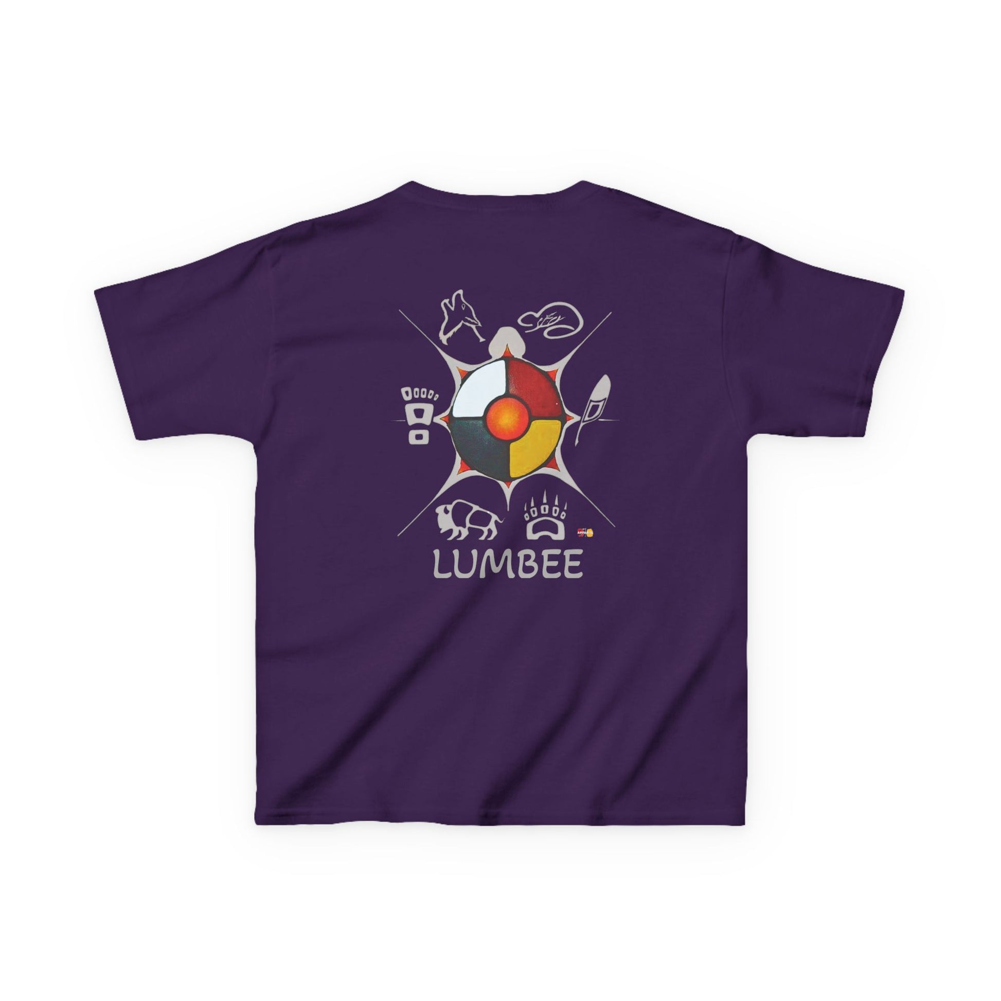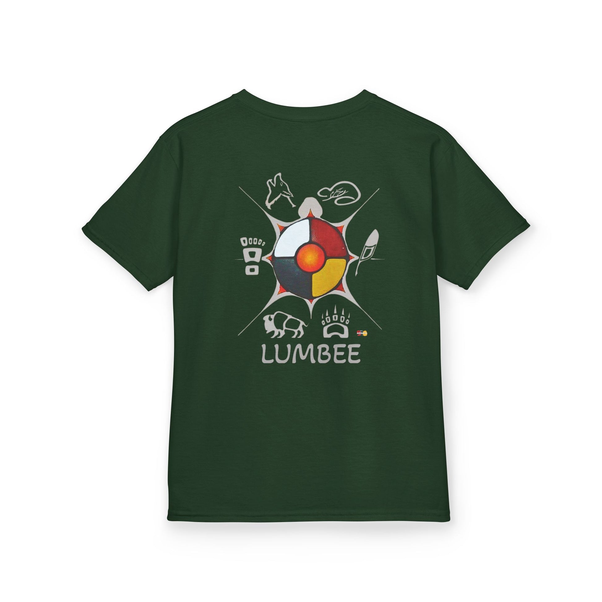 This is our Cultural Medicine Wheel Graphic Tee. The front has a small, subtle logo over the heart; the back has the medicine wheel with Native art surrounding. Wear this tee to community gatherings, powwows, or casual days whenever you want to rep our Lumbee culture and pride.