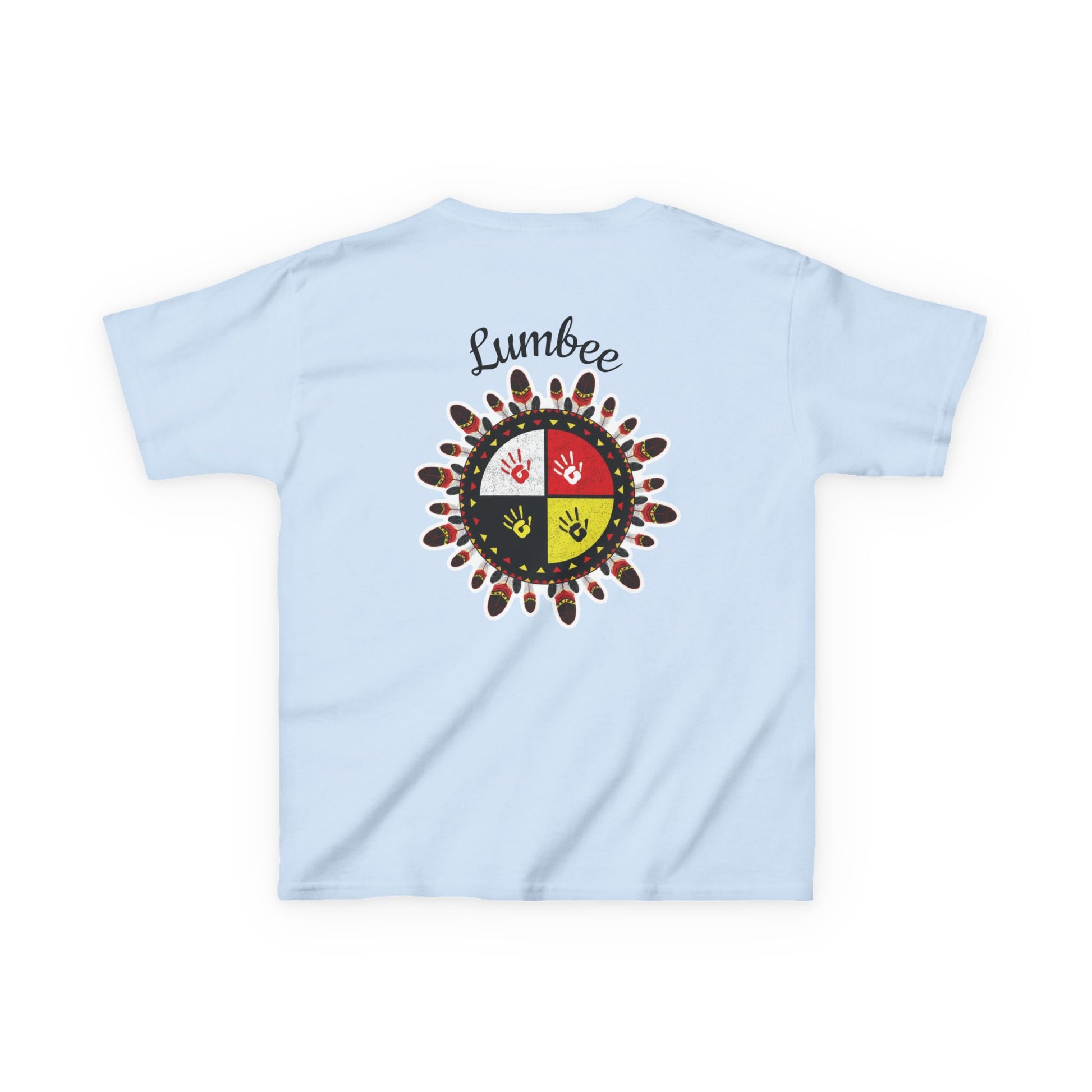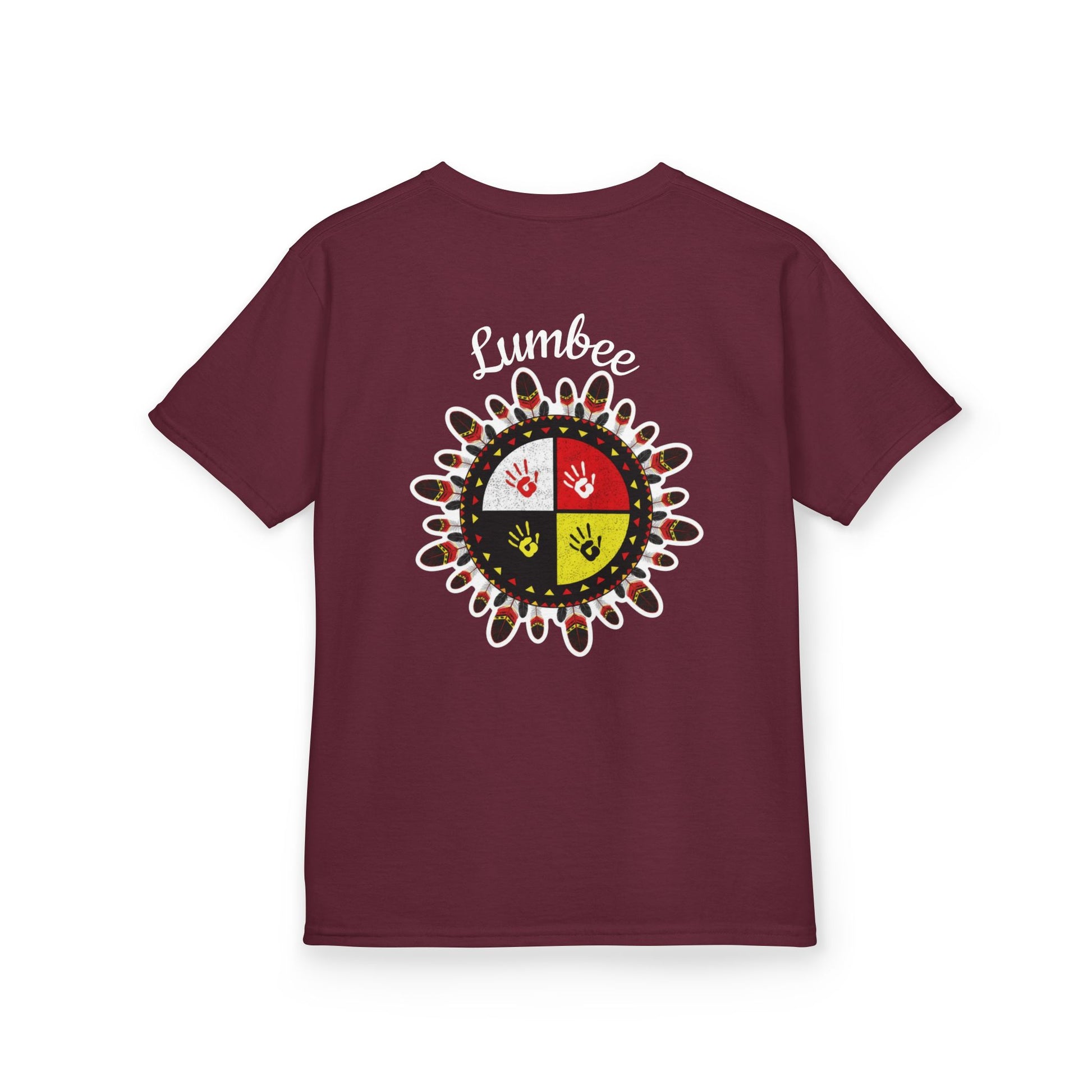 This is our Lumbee Medicine Wheel Kids Graphic Tee. The front has a small, subtle logo over the heart; the back has the medicine wheel with painted handprints. Wear this tee to community gatherings, powwows, or casual days whenever you want to rep our Lumbee culture and pride.