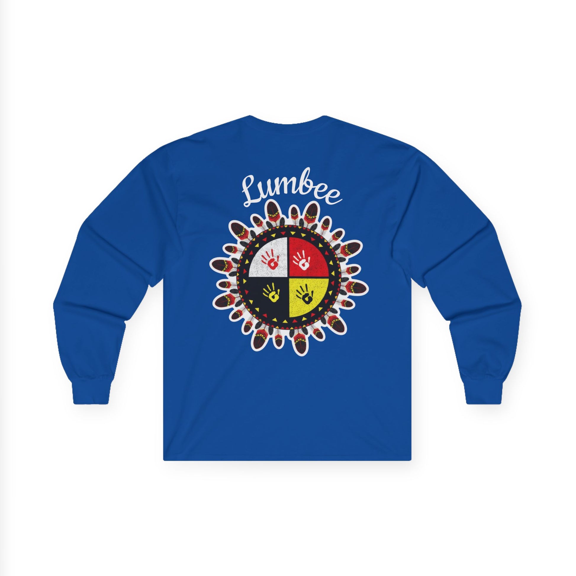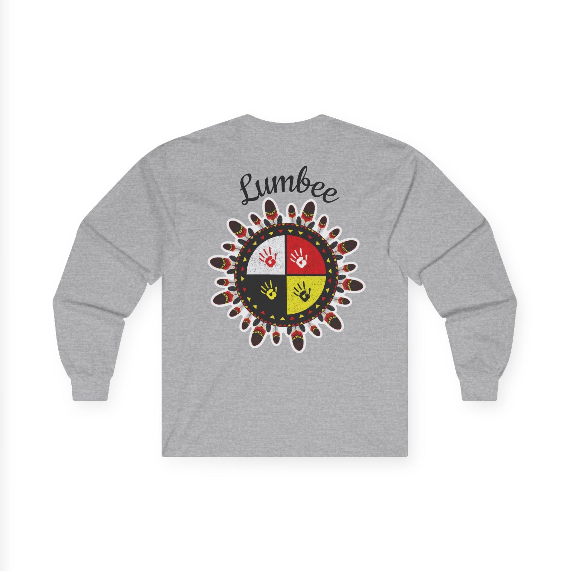 This is our Lumbee Medicine Wheel LS Graphic Tee. The front has a small, subtle logo over the heart; the back has the medicine wheel with painted handprints. Wear this tee to community gatherings, powwows, or casual days whenever you want to rep our Lumbee culture and pride.
