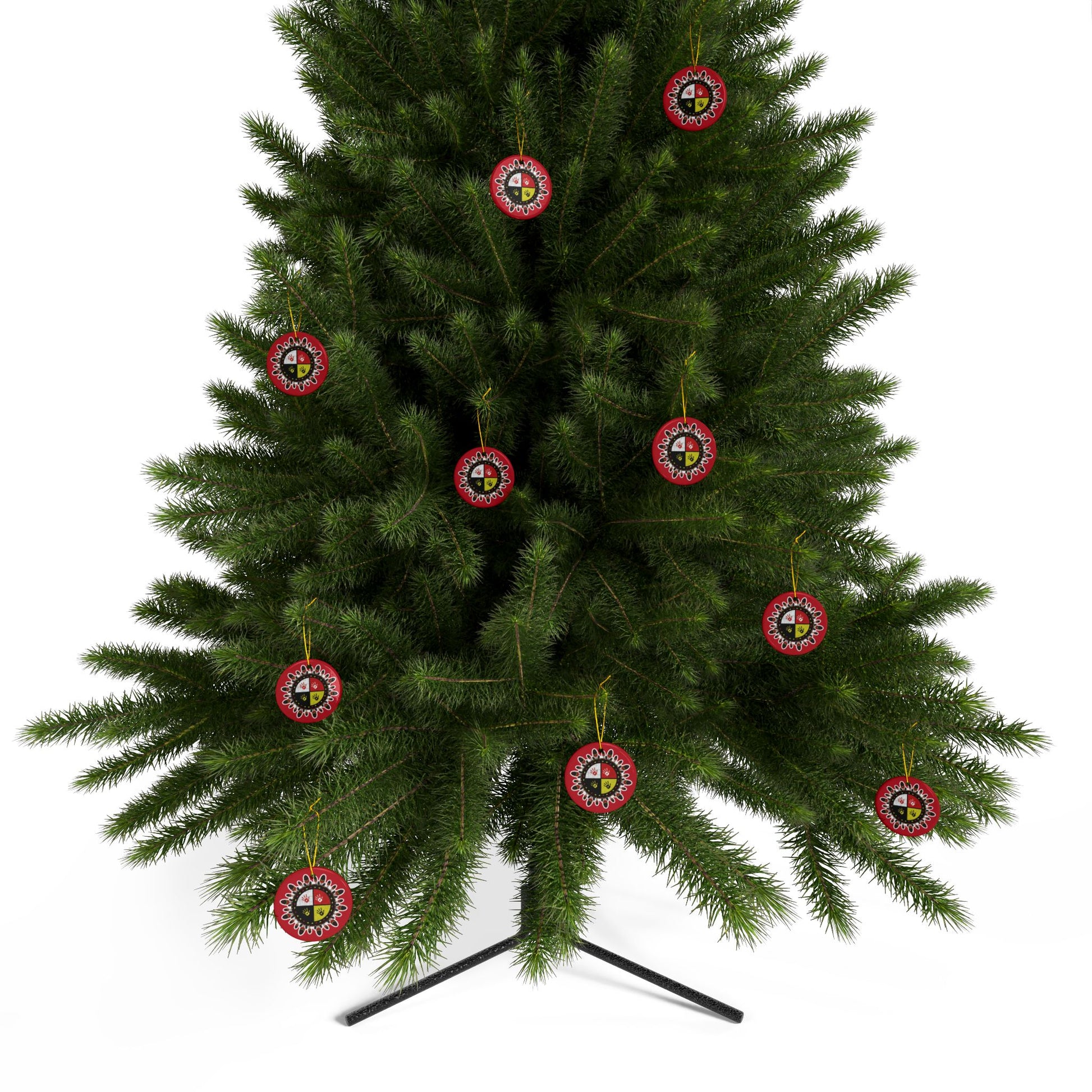 These are our Medicine Wheel Ceramic Ornaments. They are double-sided, lightweight but sturdy, and each piece hangs from a gold string to catch tree lights or morning sun. These are perfect for the Holidays, to hang on your tree and represent your Lumbee pride. Buy individually or bundle and save on our 3pc, 5pc, and 10pc.